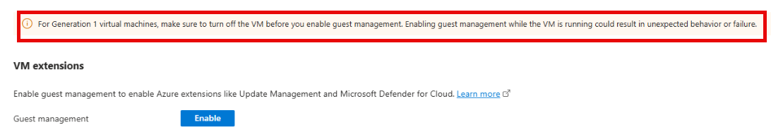 1세대 VM 게스트 관리 사용 메시지 – 게스트 관리를 사용하도록 설정하기 전에 1세대 VM의 전원이 꺼지도록 포털에 경고 메시지가 추가되었습니다.