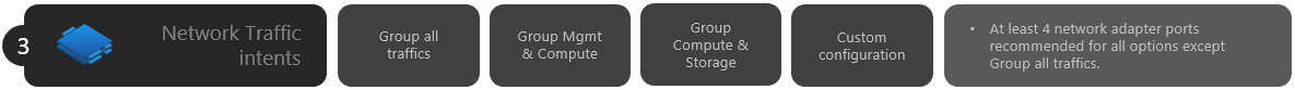 하나 이상의 의도에 관리 트래픽이 포함되는 한 사용자 고유의 구성을 사용하여 최대 3개의 의도를 정의합니다. 두 번째 컴퓨팅 의도가 필요한 경우 이 옵션을 사용하는 것이 좋습니다. 이 두 번째 컴퓨팅 의도 요구 사항에 대한 시나리오에는 원격 스토리지 트래픽, VM 백업 트래픽 또는 고유한 유형의 워크로드에 대한 별도의 컴퓨팅 의도가 포함됩니다.