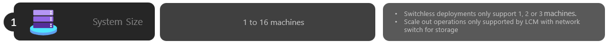 | 스토리지 스위치 없음 | Azure Portal 또는 Resource Manager 템플릿 배포를 통한 스위치리스 구성은 노드 클러스터 1개, 2개 또는 3개에서만 지원됩니다. Azure Portal 또는 Resource Manager 템플릿을 사용하여 1개 또는 2개의 노드 스토리지 스위치리스 클러스터를 배포할 수 있습니다. Resource Manager 템플릿을 사용하여 3개의 노드 스토리지 스위치리스 클러스터를 배포할 수 있습니다. 스케일 아웃 작업은 스위치리스 배포에서 지원되지 않습니다. 배포 후 노드 수를 변경하려면 수동 구성이 필요합니다. 스토리지 스위치리스 구성을 사용하는 경우 네트워크 의도가 2개 이상 필요합니다. |