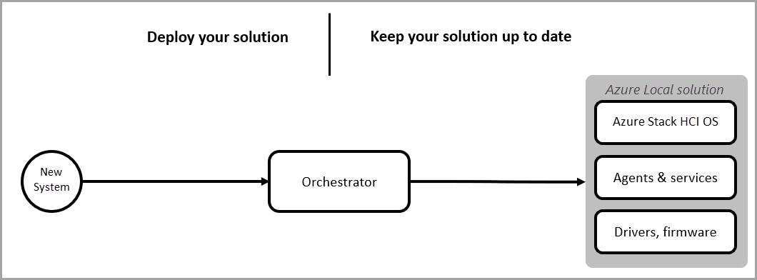 이 릴리스의 접근 방식은 Azure 로컬 솔루션의 다양한 측면을 한 곳에서 통합하고 관리할 수 있는 유연한 기반을 제공합니다. 업데이트에 대한 오케스트레이터는 배포 중에 먼저 설치되며 Azure Stack HCI OS(운영 체제), 핵심 에이전트 및 서비스 및 솔루션 확장 관리를 비롯한 새로운 배포 환경을 사용하도록 설정합니다.