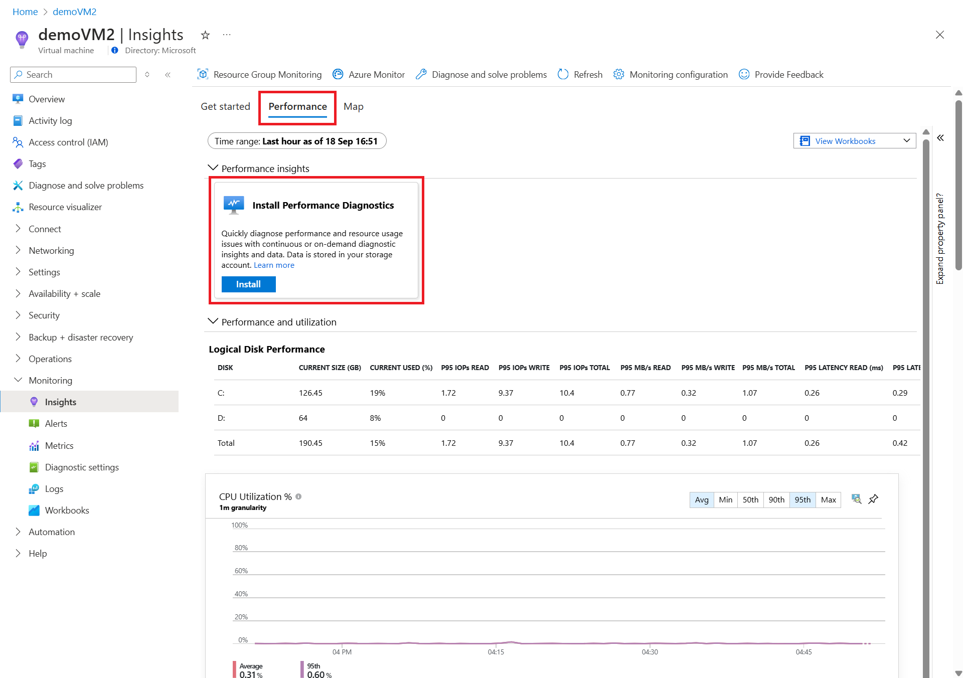 VM 인사이트에서. 모니터 메뉴의 인사이트 섹션에서 가상 머신을 선택하고 진단을 실행할 VM을 선택합니다. Performance Diagnostics 설치 타일 하단에서 설치를 선택합니다.