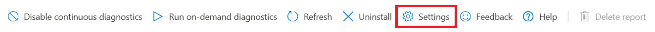 스토리지 계정을 변경하려면 VM에 성능 진단 설치에 설명된 대로 Azure Portal에서 성능 진단을 엽니다. 설정을 선택하여 성능 진단 설정 화면을 엽니다.