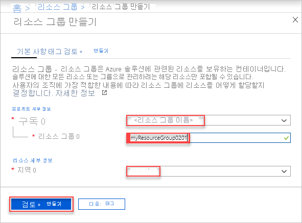 만들기를 선택합니다. 리소스 그룹을 만드는 데 몇 초 정도 걸립니다.