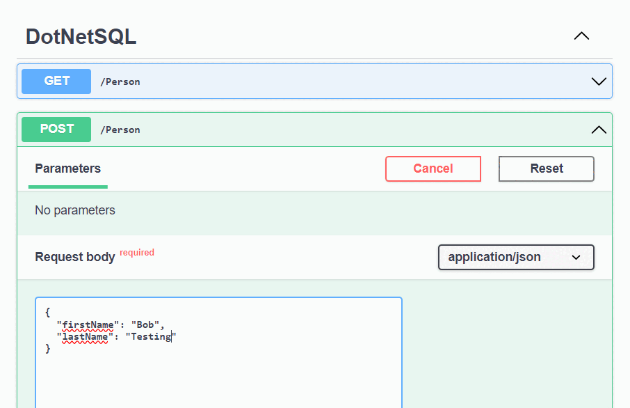 first및last이름의 값을 포함하도록 샘플 JSON을 수정합니다. 실행을 선택하여 데이터베이스에 새 기록을 추가합니다. API는 성공적인 응답을 반환합니다.GETSwagger UI 페이지에서 메서드를 확장하고 [시도]를 선택합니다. 실행을 선택하면 방금 만든 사람이 반환됩니다.