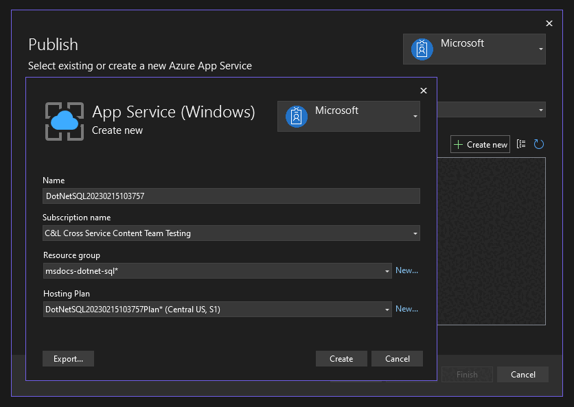 - 만들기를 선택하여 열린 대화 상자를 닫습니다. Visual Studio는 Azure에서 App Service 리소스를 만듭니다.