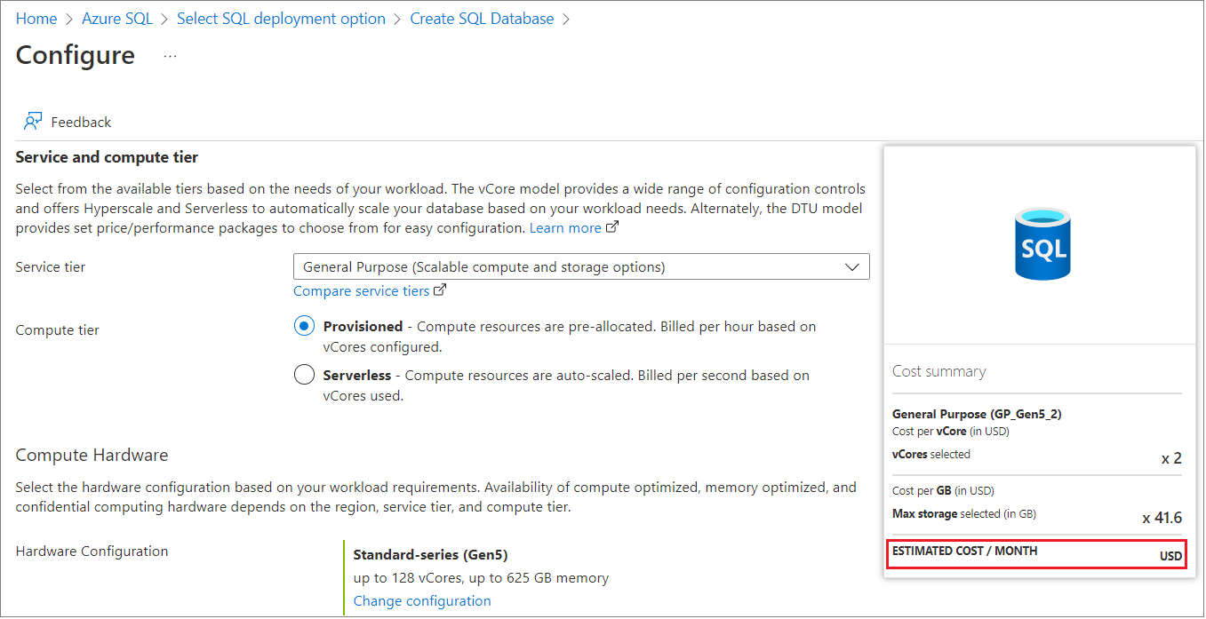 Azure SQL 데이터베이스를 만드는 프로세스를 진행하면서 컴퓨팅 계층을 구성하는 동안 예상 비용을 확인할 수 있습니다.