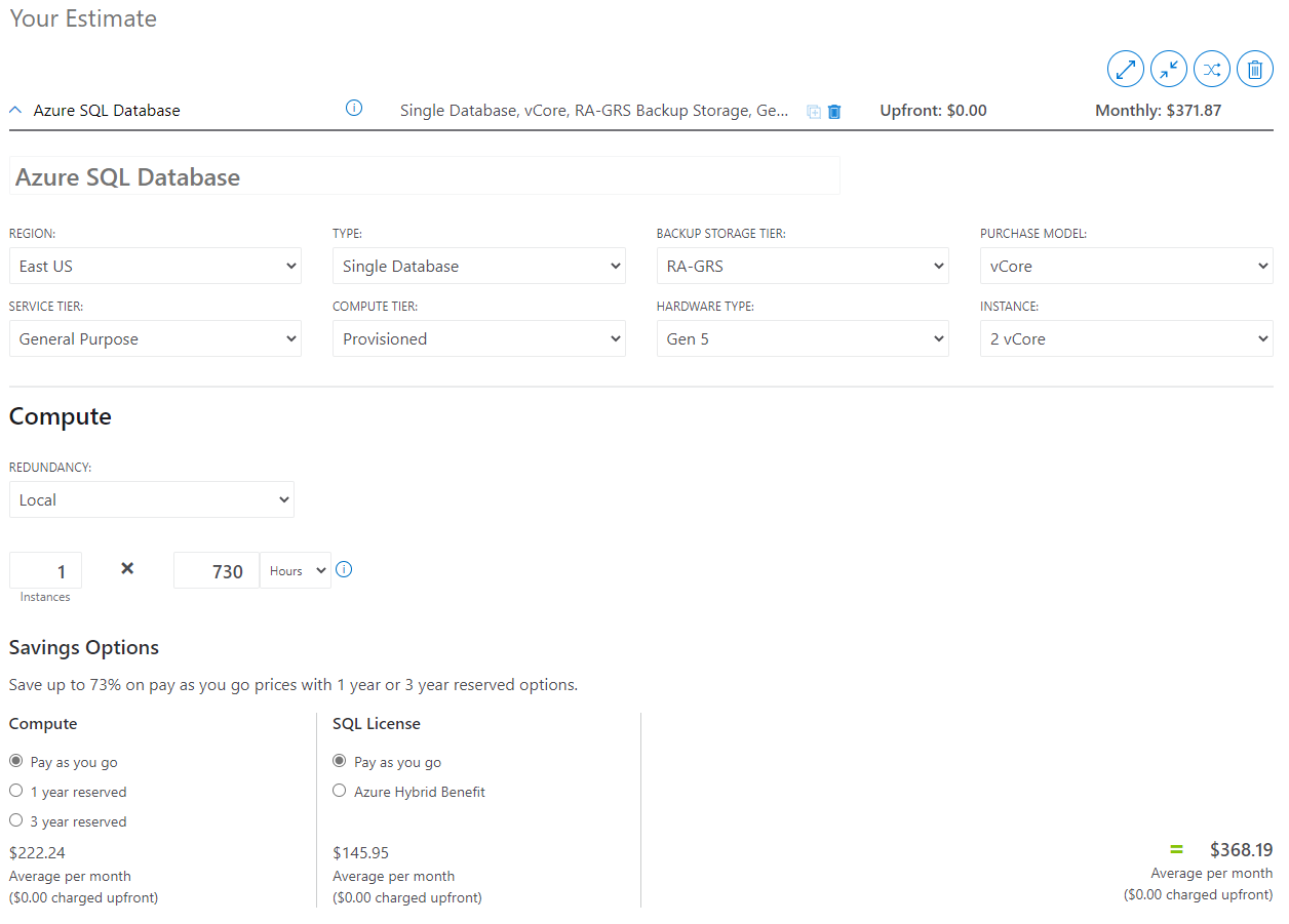 Azure 가격 계산기를 사용하여 다양한 Azure SQL Database 구성에 따른 비용을 예상할 수 있습니다. 자세한 내용은 Azure SQL Database 가격 책정을 참조하세요.