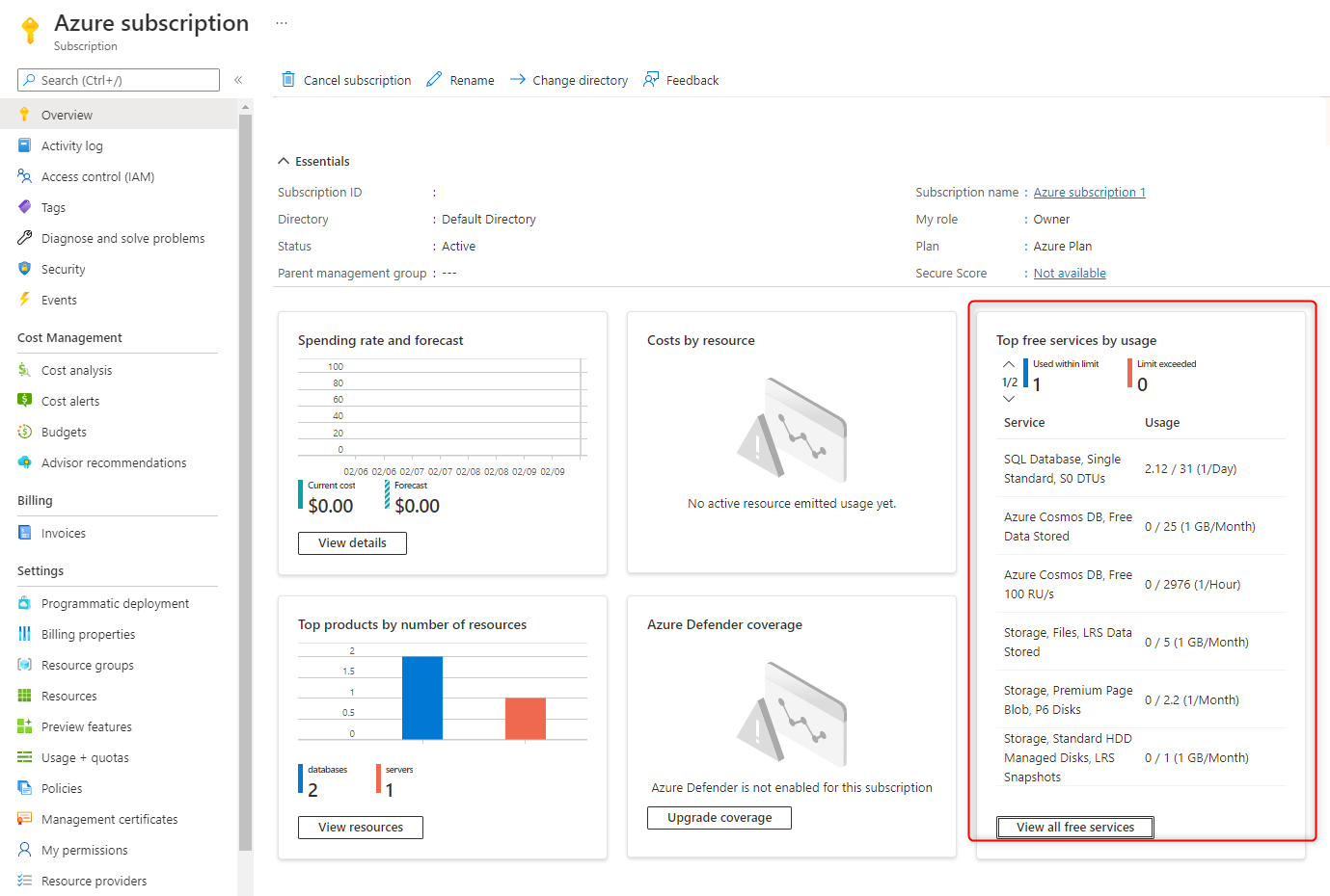 무료 서비스 제한을 초과하지 않는 한 Azure 체험 계정에 포함된 Azure SQL Database에 대해서는 요금이 부과되지 않습니다. 한도 내에서 유지하려면 Azure Portal을 사용하여 무료 서비스 사용량을 추적하고 모니터링합니다.