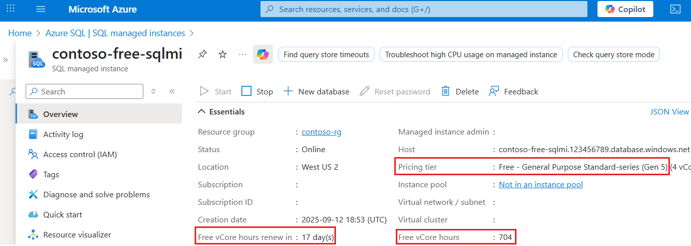 원래 무료 SQL Managed Instance를 삭제하고 새 SQL Managed Instance를 만들면 무료 크레딧이 다시 설정되지 않습니다. 현재 월의 나머지 vCore 시간은 새 인스턴스로 이월되며 전체 720 vCore 시간은 원래 월별 갱신 날짜에 다시 사용할 수 있습니다.