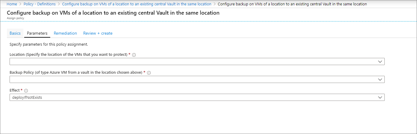 이 정책을 사용하면 중앙 백업 팀이 관리되는 VM과 동일한 구독 및 지역에 위치한 중앙 Recovery Services 볼트를 사용하여 Azure Virtual Machines의 백업을 구성할 수 있습니다. 지정된 태그를 사용하여 정책 범위에서 특정 VM을 제외 할 수 있습니다.