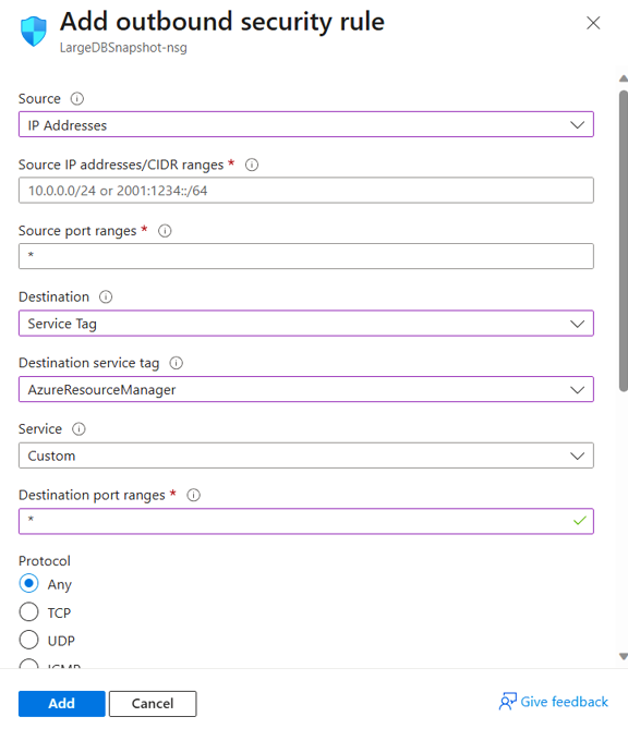 추가를 선택합니다. 보안 규칙 설정에 설명된 대로 새 규칙을 만드는 데 필요한 세부 정보를 모두 입력합니다. 대상 옵션이 서비스 태그로 설정되고 대상 서비스 태그가 AzureBackup으로 설정되어 있는지 확인합니다.