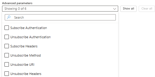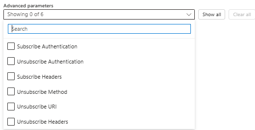 구독 취소 메서드 및 구독 취소 URI 속성의 경우 고급 매개 변수 목록을 열어 작업에 추가합니다.