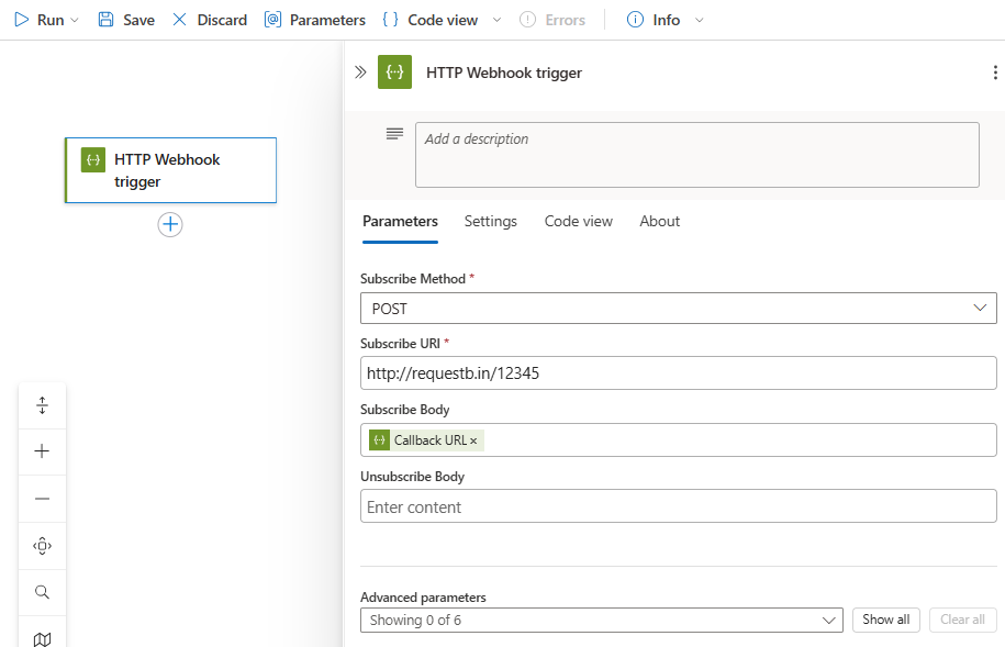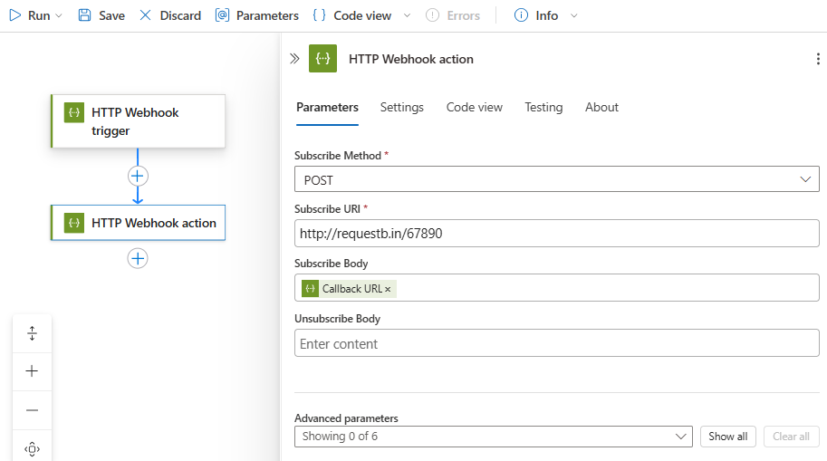 구독 및 구독 취소 호출 에 사용할 HTTP 웹후크 트리거 매개 변수와 유사한 HTTP 웹후크 작업 매개 변수에 대한 값을 제공합니다.