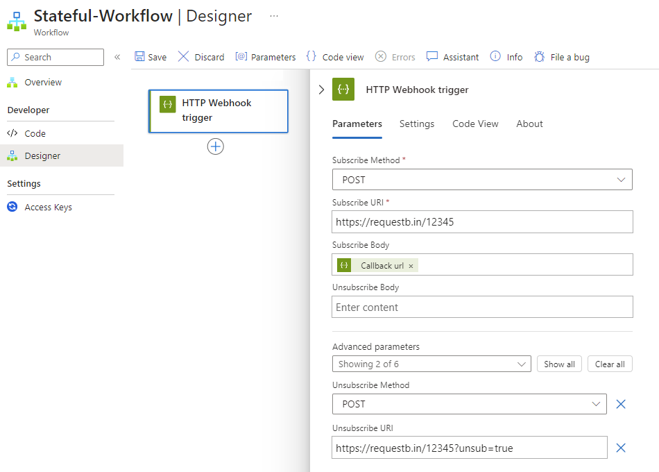 구독 호출 및 구독 취소 호출에 사용할 Http Webhook 트리거 매개 변수를 위한 값을 제공합니다.