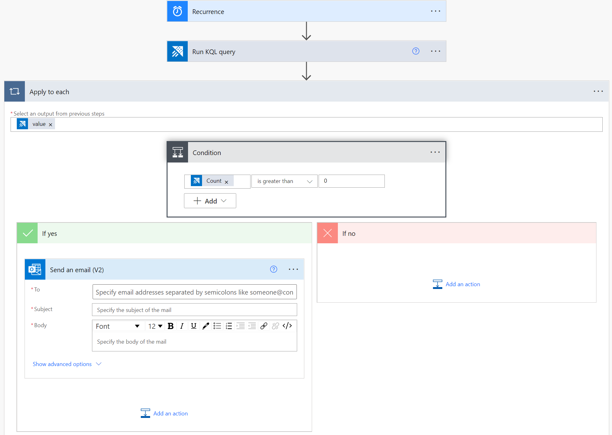 이 작업을 사용하여 KQL 쿼리 결과를 테이블 또는 차트로 시각화합니다. 예를 들어 이 흐름을 사용하여 이메일을 통해 일별 보고서를 받을 수 있습니다.