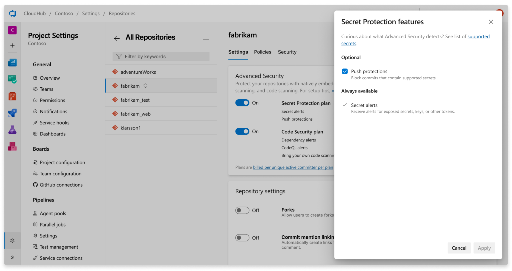 조직, 프로젝트 또는 리포지토리 수준에서 비밀 보호 또는 코드 보안을 사용하도록 설정할 수 있습니다.