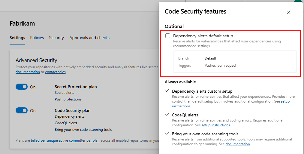 고급 설정 또는 모든 분기를 검색하려는 경우 검사하려는 모든 파이프라인에 종속성 검사 작업을 추가하는 것이 좋습니다. 자세한 내용은 Azure DevOps용 GitHub 고급 보안에 대한 종속성 검사를 참조하세요.