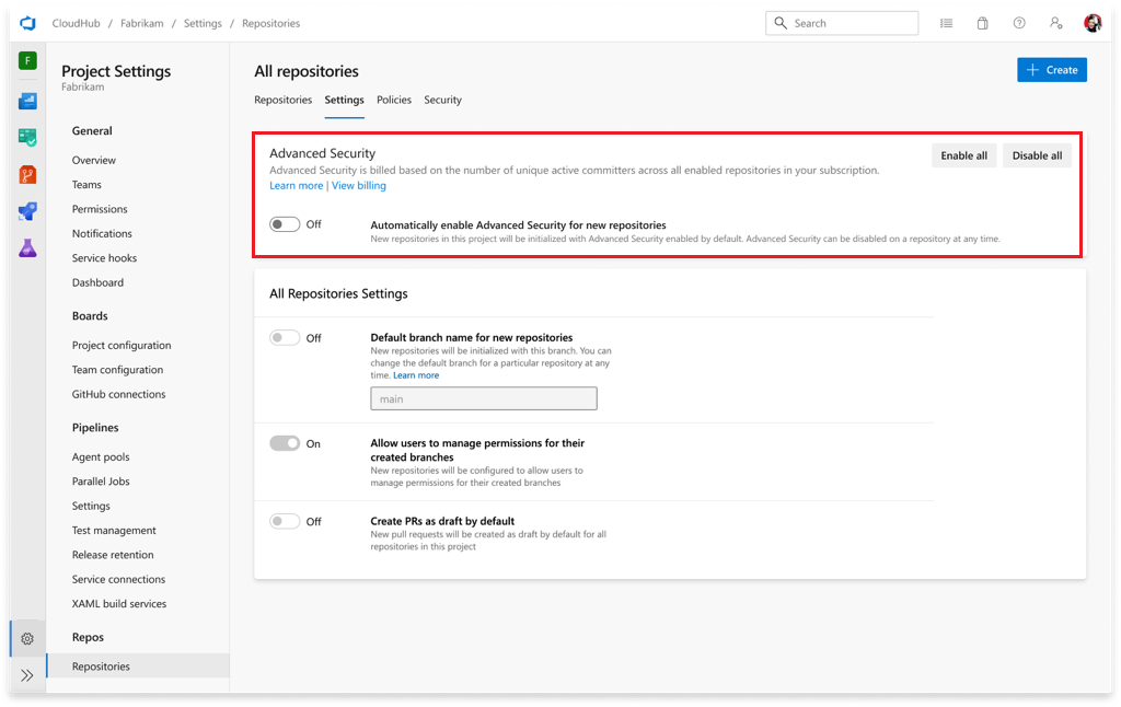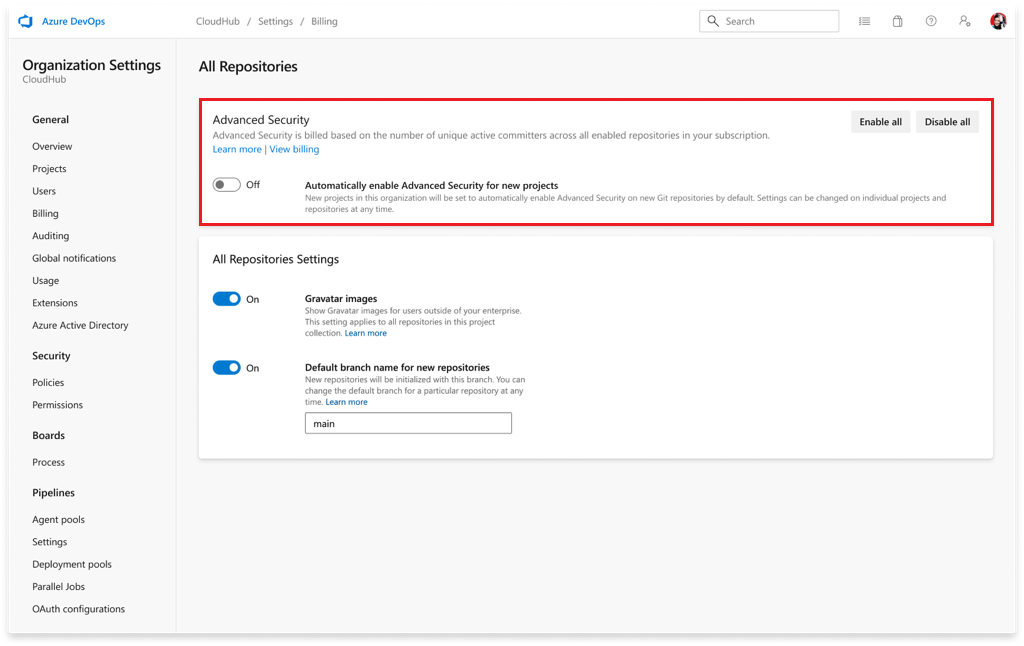 - 조직의 각 프로젝트에 있는 모든 기존 리포지토리에 대해 고급 보안을 활성화하려면 청구 시작을 선택합니다.