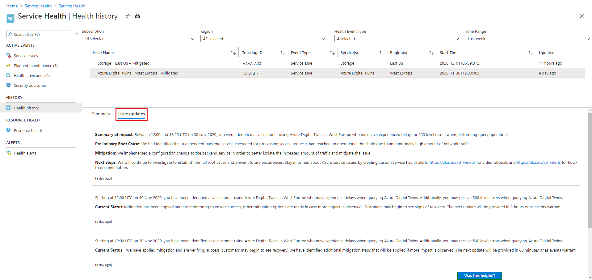 Azure Digital Twins 인스턴스가 장애 조치(failover)되고 복구되면 Azure Service Health 도구를 사용하여 프로세스를 모니터링할 수 있습니다. Service Health는 서로 다른 지역 및 구독에서 Azure 서비스의 상태를 추적하고 중단 및 가동 중지 시간에 대해 서비스에 영향을 주는 통신을 공유합니다.