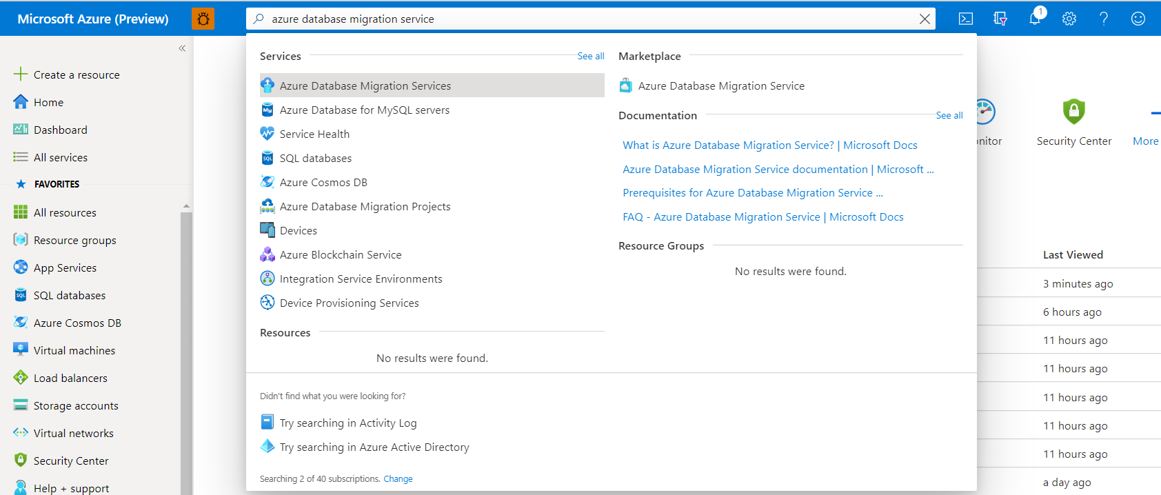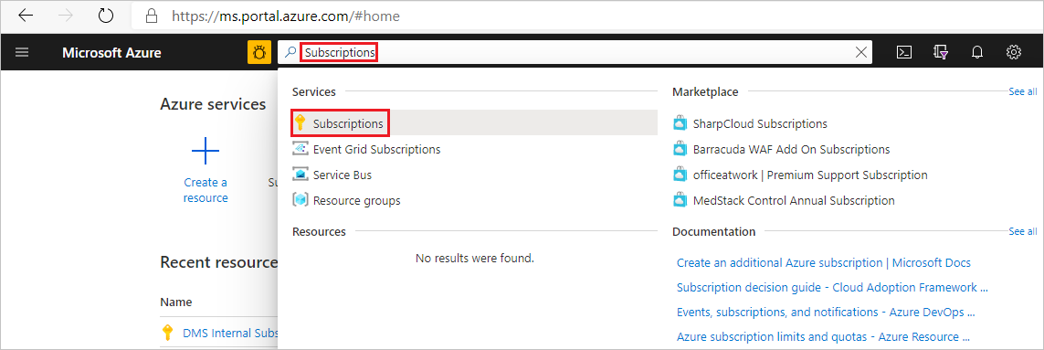 첫 번째 DMS 인스턴스를 만들기 전에 Azure Portal에 로그인한 다음 구독을 검색하여 선택합니다.