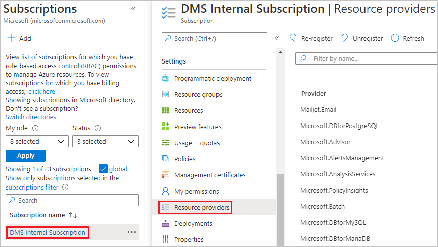 Microsoft.DataMigration 리소스 공급자를 등록하려면 다음 단계를 수행합니다.