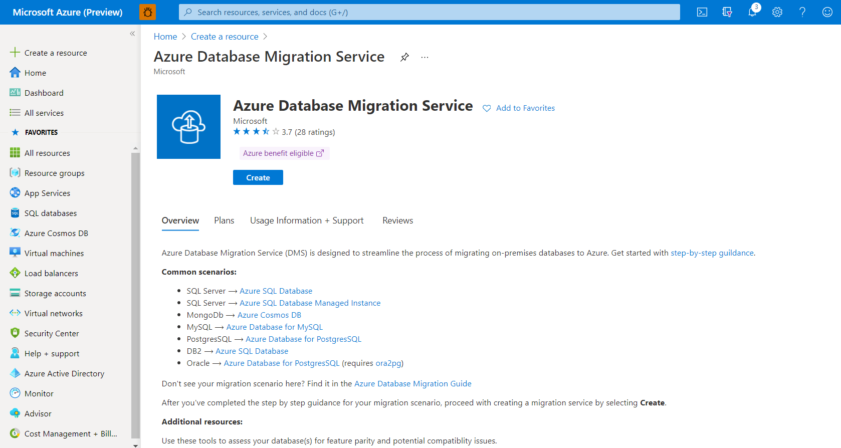 Azure Database Migration Service 화면에서 만들기를 선택합니다.