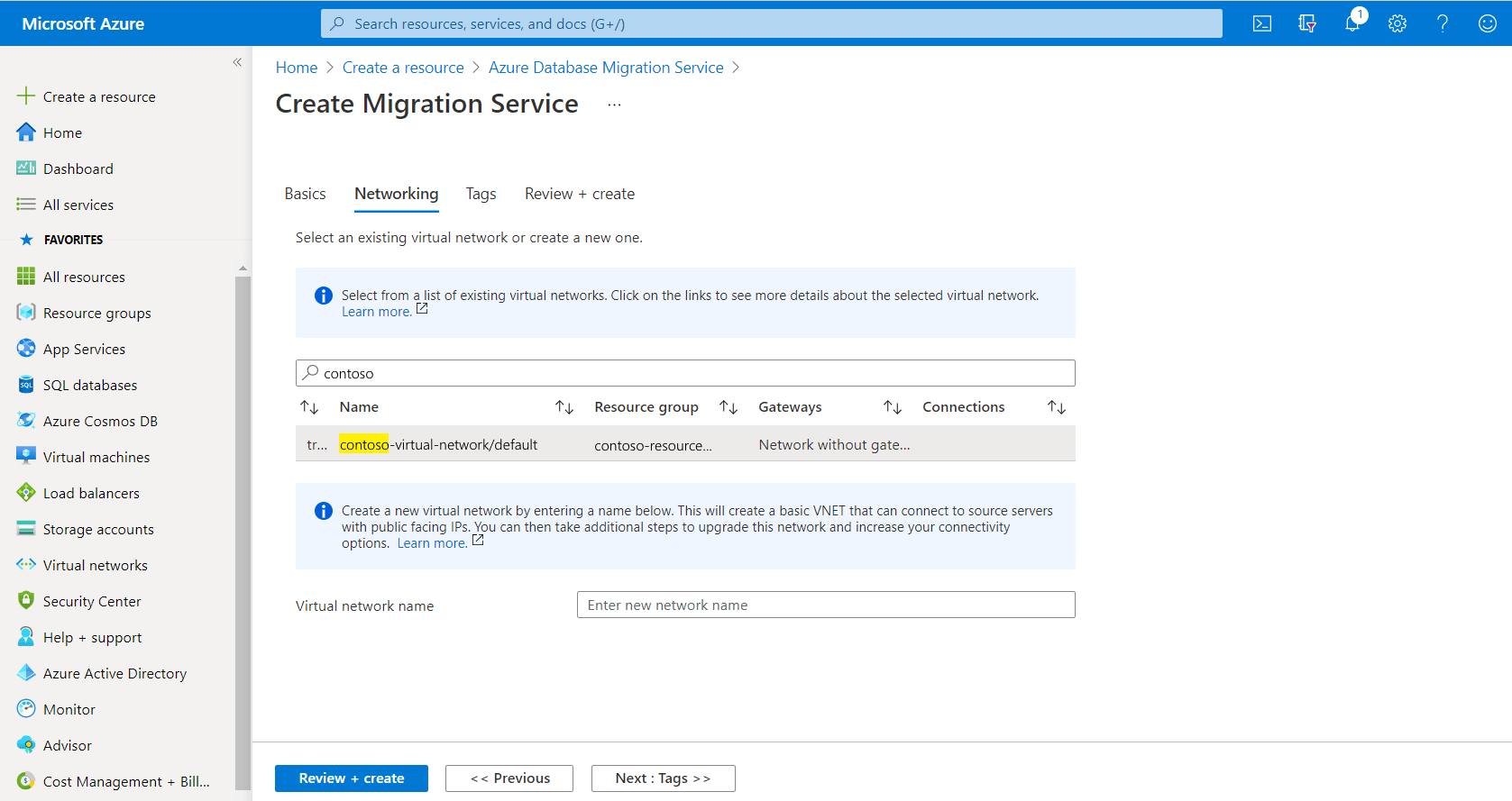 목록에서 기존 가상 네트워크를 선택하거나 만들려는 새 가상 네트워크의 이름을 입력합니다. 검토 후 만들기 화면으로 이동합니다. 필요에 따라 태그 화면에서 서비스에 태그를 추가할 수 있습니다.