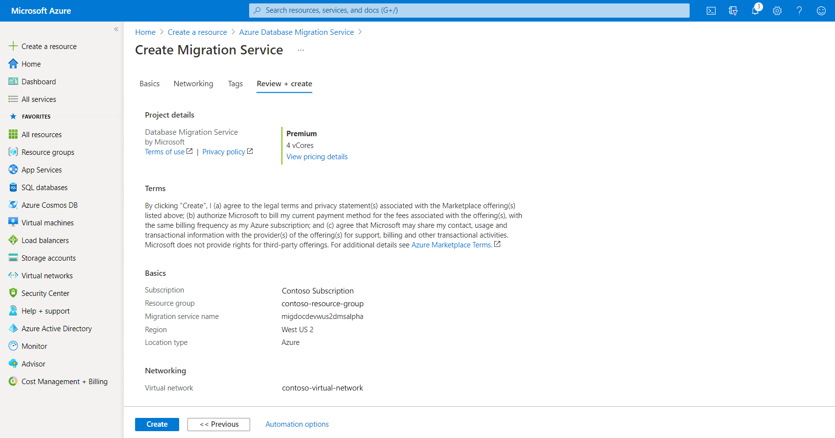 Migration Service 만들기 화면에서 서비스, 구독, 신규 또는 기존 리소스 그룹의 이름을 지정합니다.