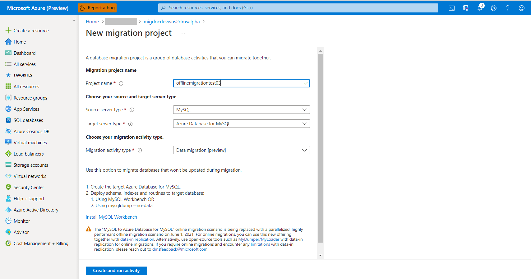 새 마이그레이션 프로젝트 화면에서 프로젝트의 이름을 지정하고, 원본 서버 유형 선택 상자에서 MySQL을 선택하고, 대상 서버 유형 선택 상자에서 Azure Database For MySQL을 선택하고, 마이그레이션 작업 유형 선택 상자에서 데이터 마이그레이션을 선택합니다. 활동 만들기 및 실행을 선택합니다.