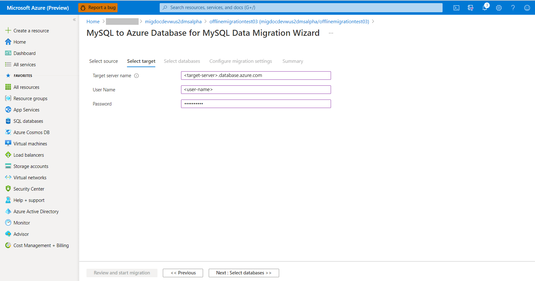 대상 선택 화면에서 대상 Azure Database for MySQL 인스턴스에 대한 연결 세부 정보를 지정하고 다음을 선택합니다. 데이터베이스 >>선택