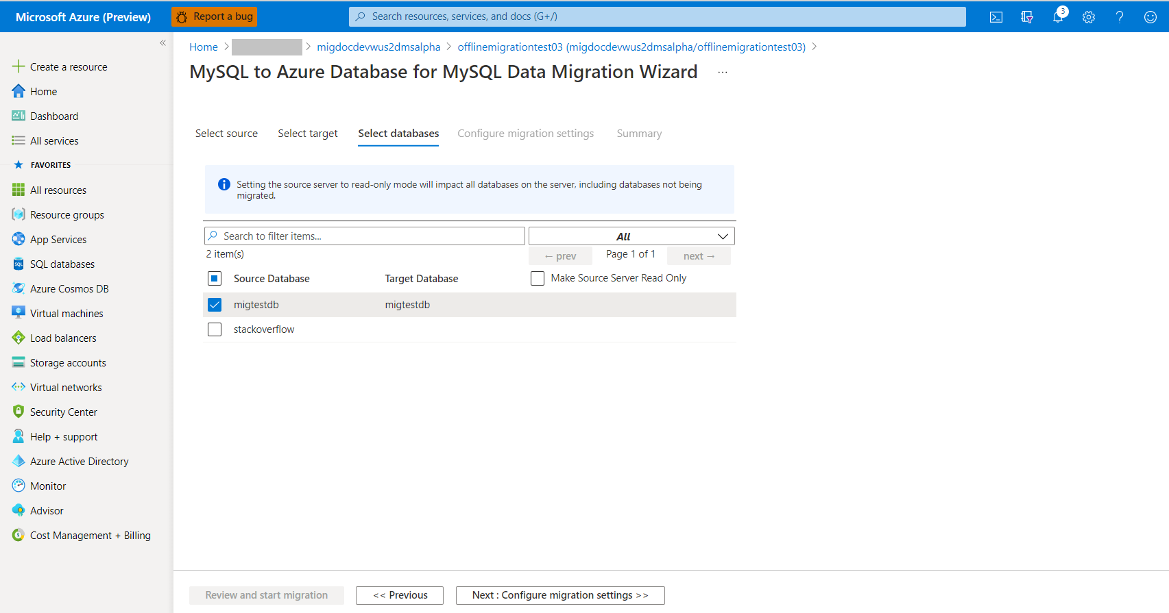 데이터베이스 선택 화면에서 마이그레이션할 원본 및 대상 데이터베이스를 매핑하고 다음: 마이그레이션 설정 >>구성을 선택합니다. 원본 서버를 읽기 전용으로 만들기 옵션을 선택하면 원본을 읽기 전용으로 만들 수 있지만 이는 서버 수준 설정이므로 주의해야 합니다. 이 옵션을 선택하는 경우 선택한 데이터베이스뿐만 아니라 전체 서버가 읽기 전용으로 설정됩니다.