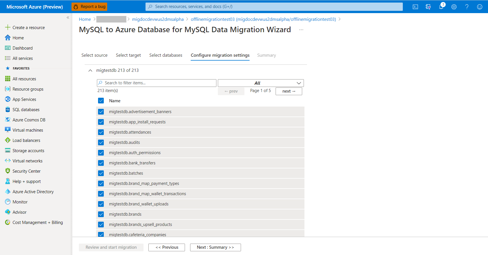 마이그레이션 설정 구성 화면에서 마이그레이션의 일부로 사용할 테이블을 선택하고 다음: 요약>>을 선택합니다. 대상 테이블에 데이터가 있는 경우 기본적으로 선택되지 않지만 명시적으로 선택할 수 있으며 마이그레이션을 시작하기 전에 잘립니다.