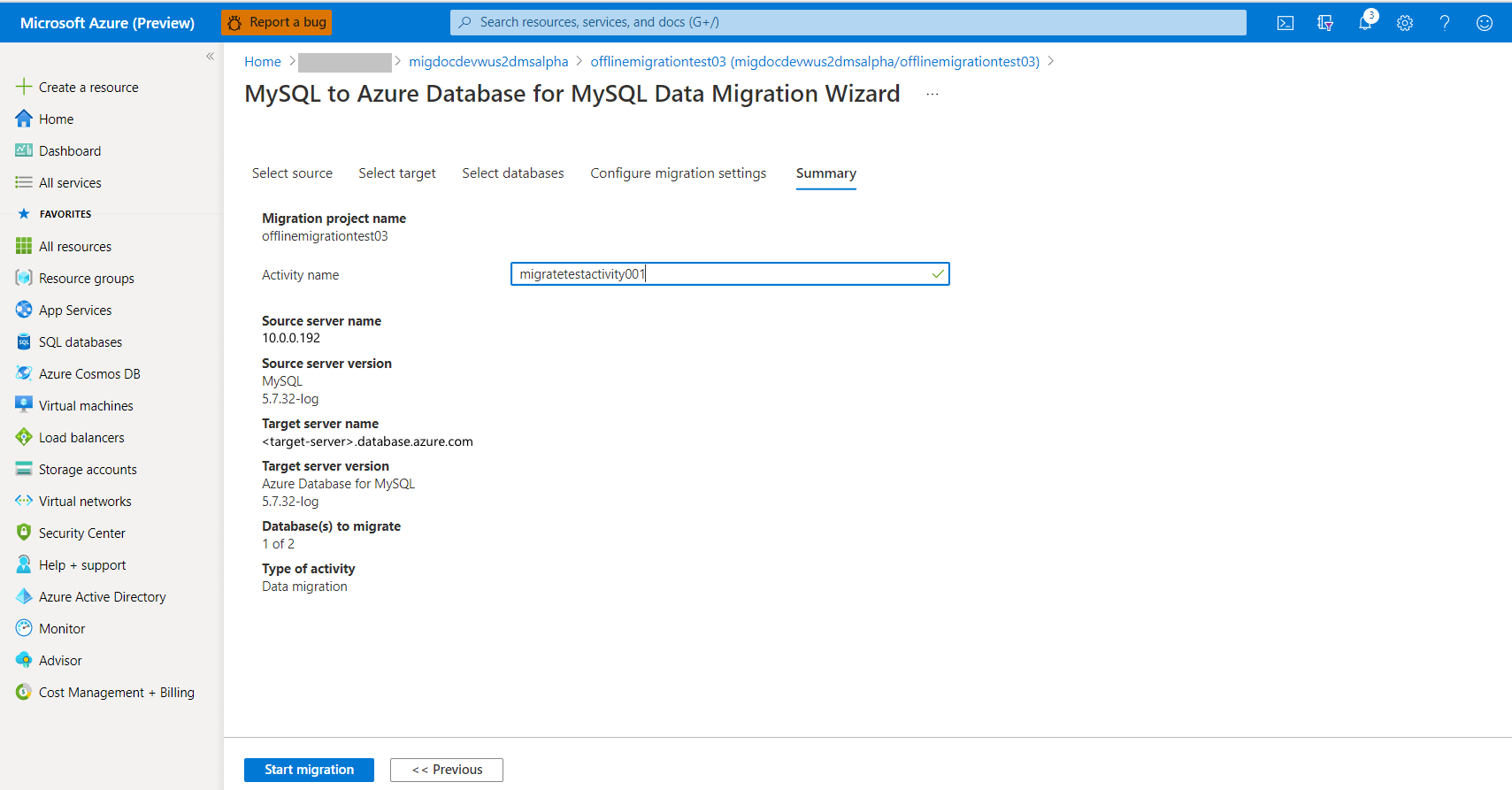 서버 수준 방화벽 규칙을 만들거나 대상 Azure Database for MySQL에 대한 가상 네트워크 서비스 엔드포인트를 구성 하여 대상 데이터베이스에 대한 Azure Database Migration Service용 Virtual Network 액세스를 허용합니다.