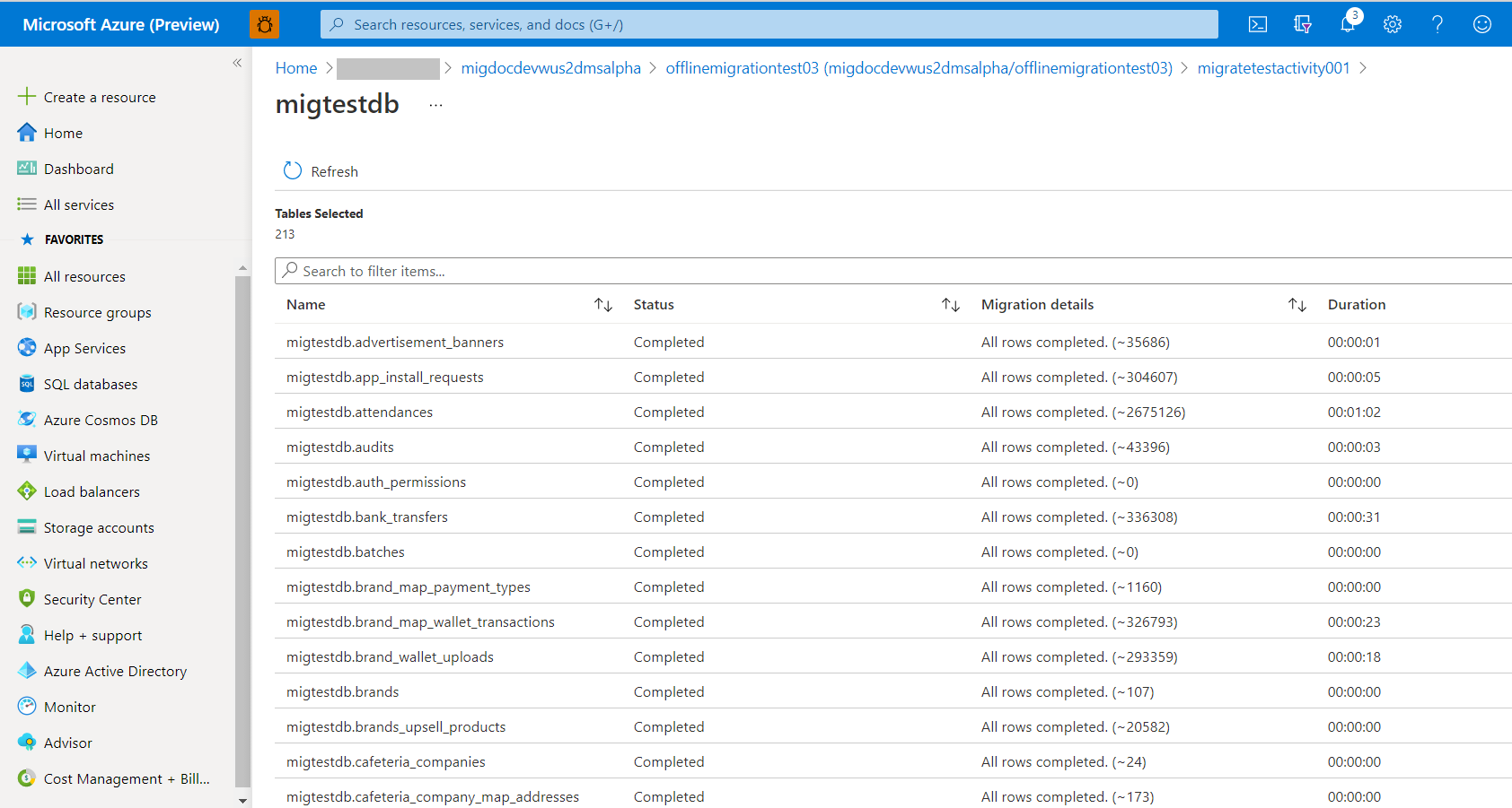 작업 화면에서 데이터베이스 이름을 선택하여 마이그레이션할 때 각 테이블의 상태를 확인할 수 있습니다. 새로 고침을 선택하여 디스플레이를 업데이트합니다.