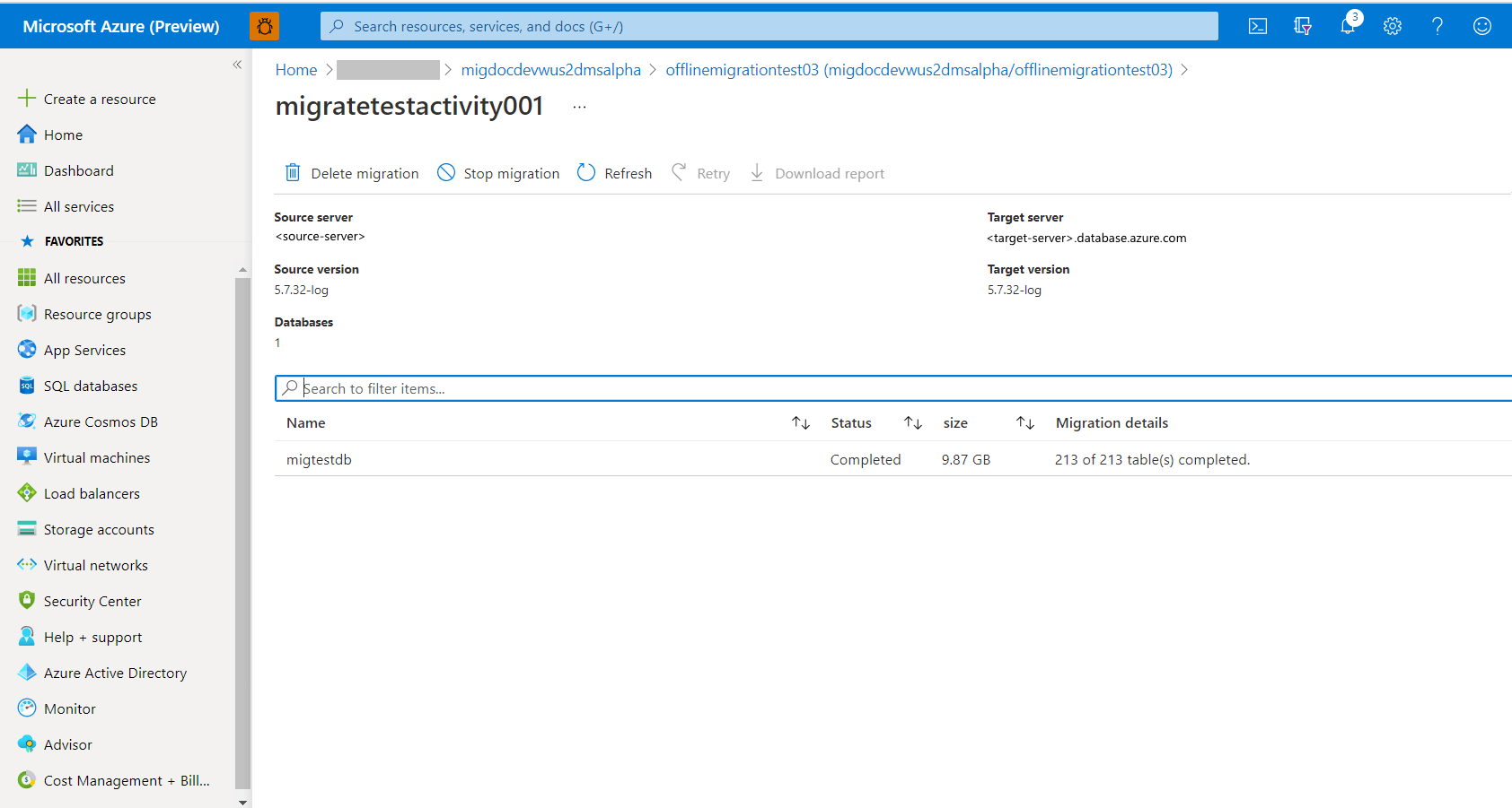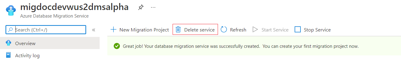 검색 결과에서 마이그레이션 서비스 인스턴스를 선택하고 서비스 삭제를 선택합니다.