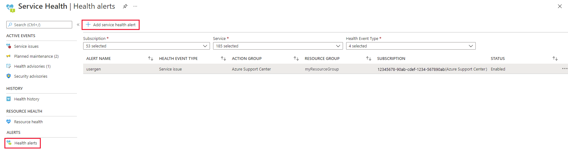Azure Service Health는 유지 관리 이벤트에 대한 사용자 지정 경고를 지원합니다. ExpressRoute 경로 회로 유지 관리에 대한 경고를 구성하려면 페이지 왼쪽에 있는 경고 섹션에서 상태 경고로 이동합니다. 여기에서 이전에 구성된 경고 테이블을 볼 수 있습니다.