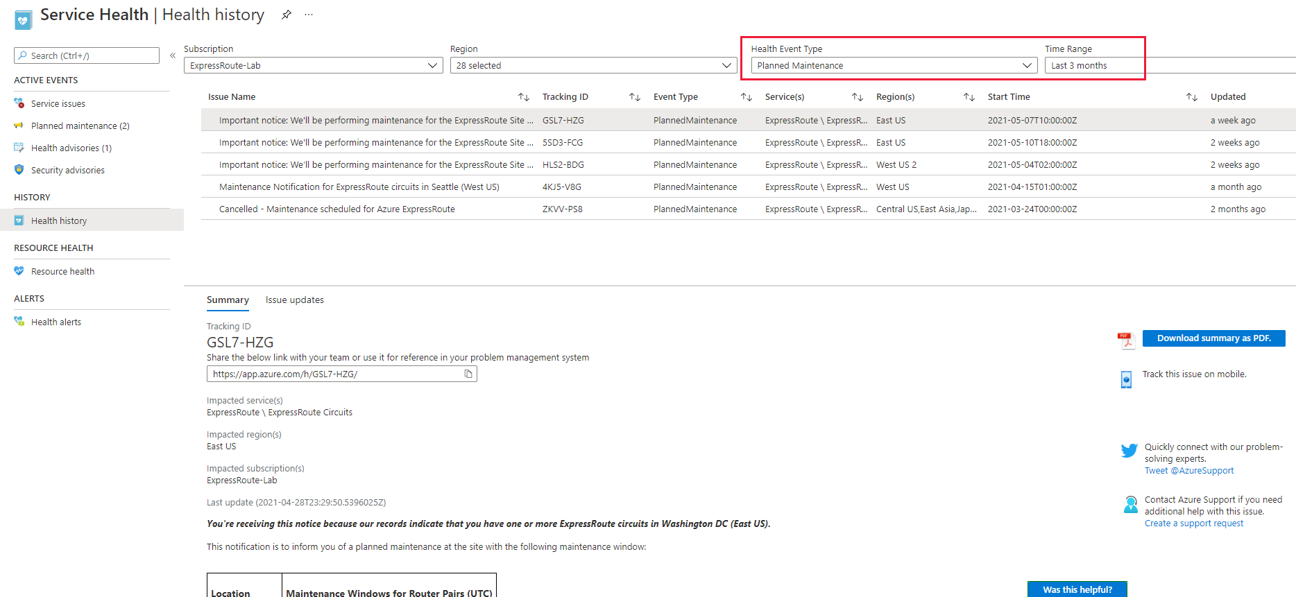 ExpressRoute는 Azure Service Health를 사용하여 계획되고 예정된 ExpressRoute 회로 유지 관리를 알립니다. Service Health를 사용하면 Azure Portal에서 계획된 유지 관리와 과거 유지 관리를 보고 요구 사항에 가장 적합한 경고와 알림을 구성할 수 있습니다. Azure Service Health에 대한 자세한 내용은 Azure Service Health란?을 참조하세요.