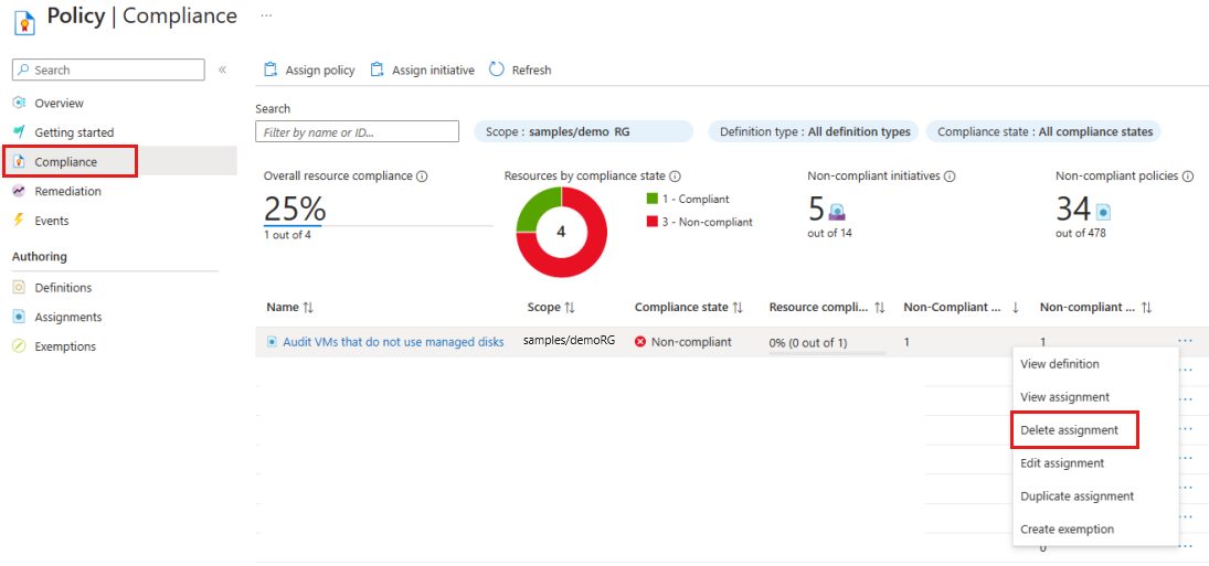 준수 또는 할당에서 정책 할당을 삭제할 수 있습니다.