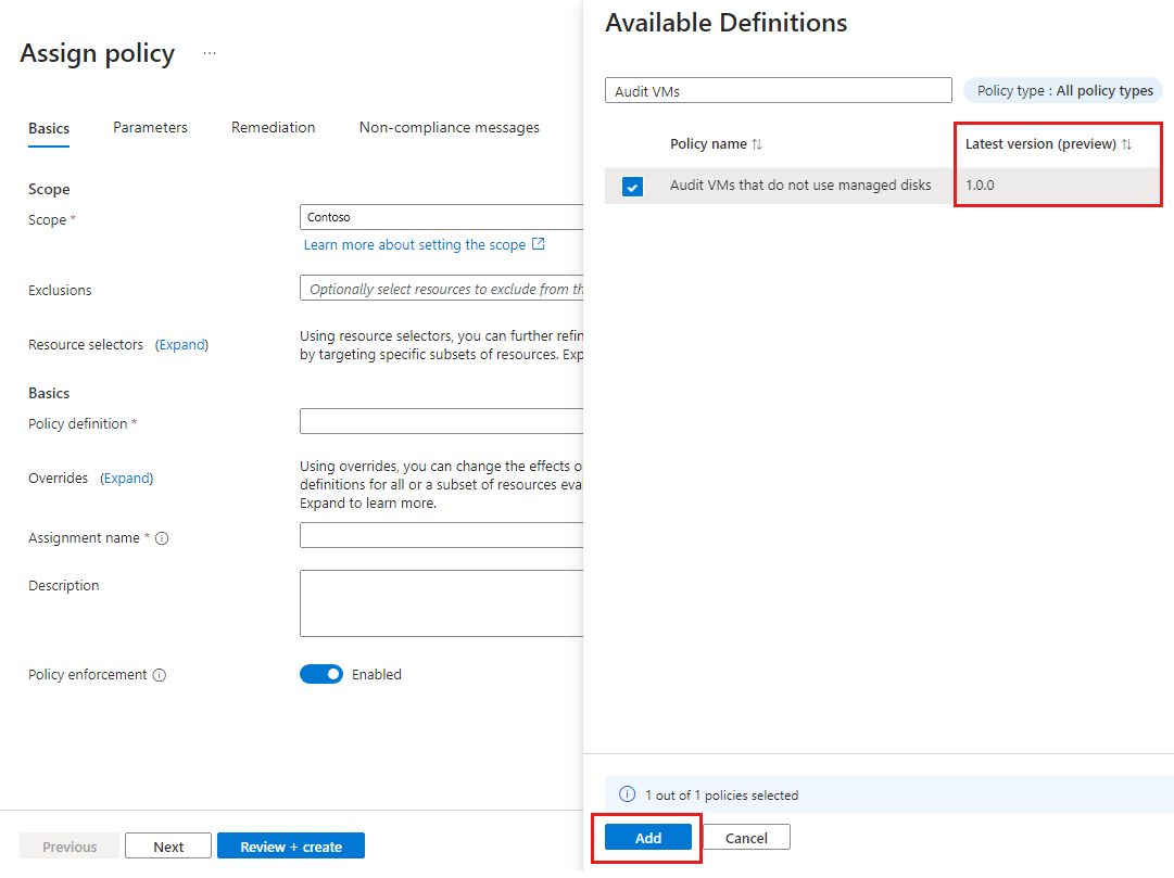 )를 선택합니다.사용 가능한 정의 관리 디스크를 사용하지 않는 VM 감사 정의에 대한 정책 정의 목록을 검색하고 정책을 선택한 다음 추가를 선택합니다. 최신 버전의 정의를 표시하는 열이 있습니다. 버전(미리 보기) 주 버전, 부 버전, 패치 버전을 수집하려면 1.*.*