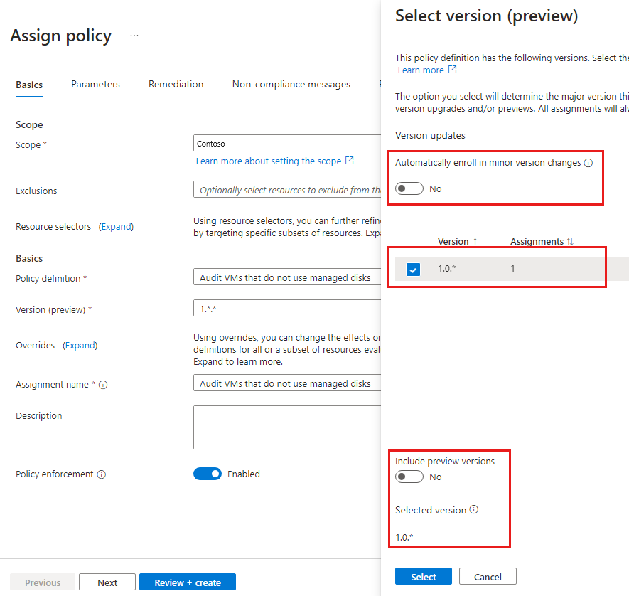 기본 제공 정책 또는 이니셔티브 정의를 할당할 때 버전을 참조하는 것은 선택 사항입니다. 기본 제공 정의의 정책 할당은 기본적으로 최신 버전으로 지정되며 별도로 지정하지 않는 한 자동으로 부 버전 변경 내용을 상속합니다.