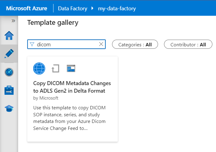 템플릿 갤러리에서 DICOM을 검색합니다. DICOM 메타데이터 변경 내용을 델타 형식으로 ADLS Gen2로 복사 타일을 선택한 다음 계속을 선택합니다.