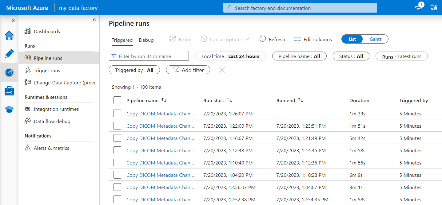 Data Factory 파이프라인은 DICOM 메타데이터를 델타 테이블에 복사하는 것과 같은 작업을 수행하는 작업의 컬렉션입니다. 이 섹션에서는 DICOM 서비스에서 데이터가 추가, 업데이트 및 삭제될 때 DICOM 데이터를 델타 테이블에 정기적으로 동기화하는 파이프라인을 만드는 방법을 자세히 설명합니다.