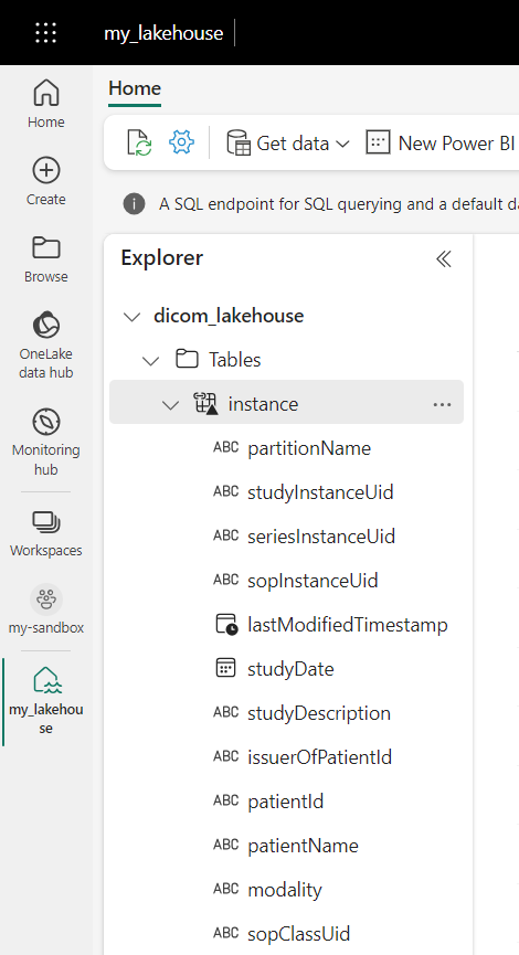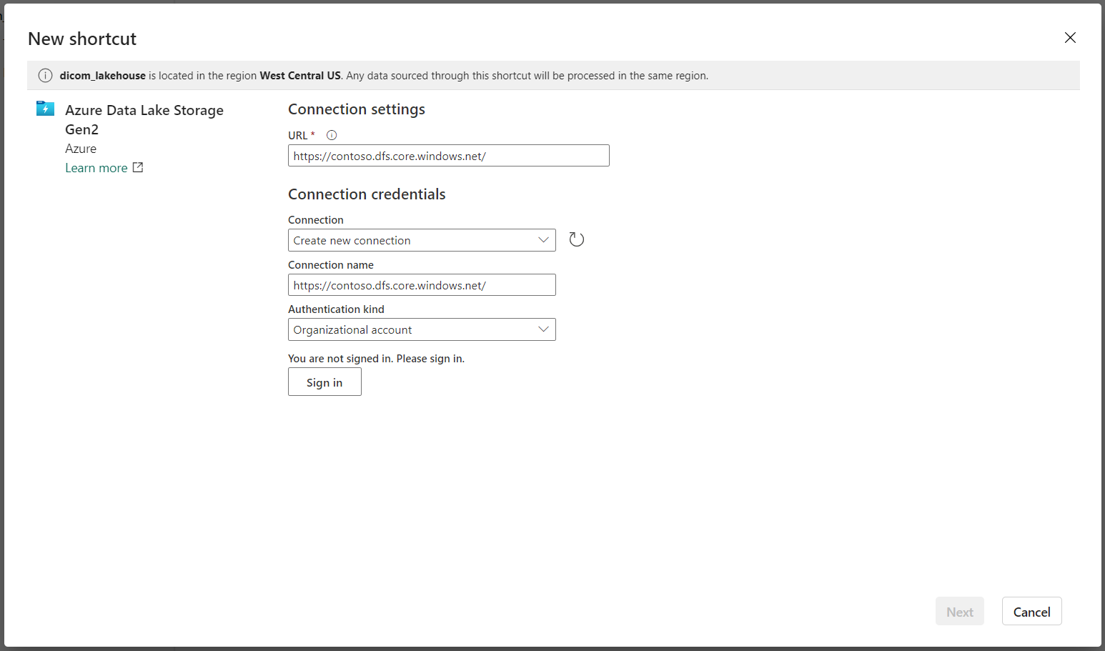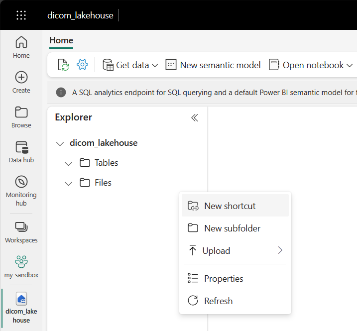 - 바로 가기를 사용하여 스토리지 계정의 DICOM 데이터를 Fabric 레이크하우스에 연결합니다.