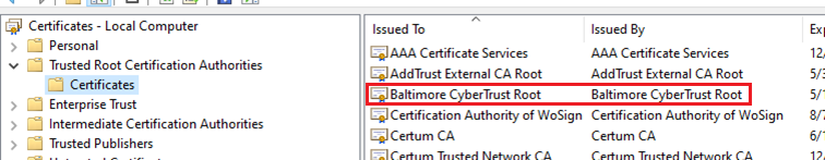 루트 CA(인증 기관)는 Baltimore CyberTrust 루트 인증서입니다. DigiCert는 이 루트 인증서에 서명하며 널리 신뢰할 수 있으며 많은 운영 체제에 저장됩니다. 예를 들어, Ubuntu와 Windows 모두 기본 인증서 저장소에 이를 포함합니다.
