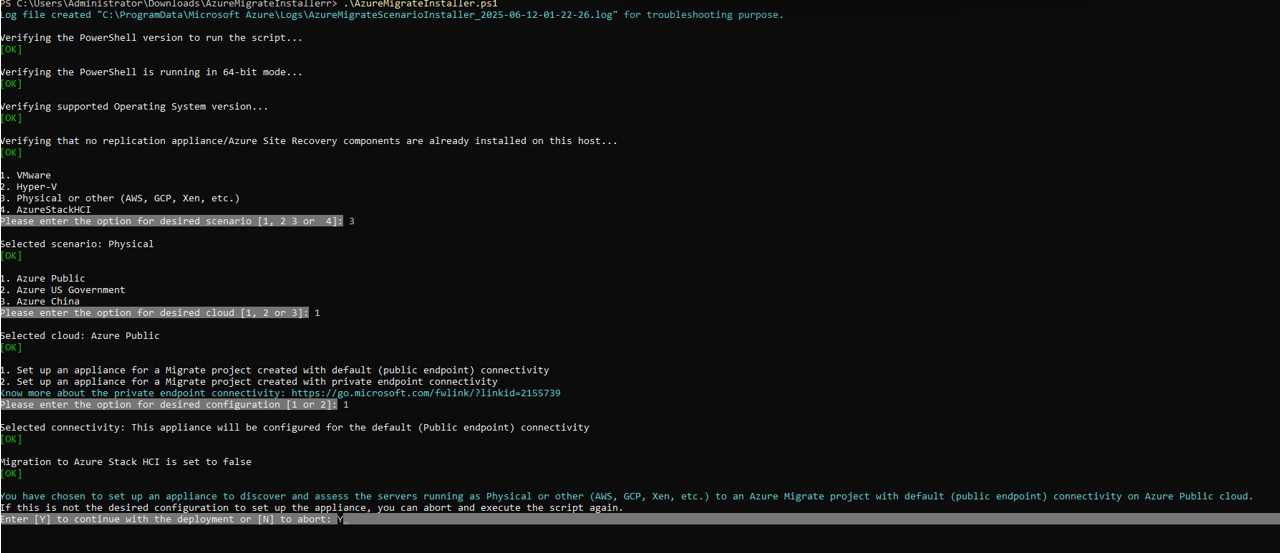AzureMigrateInstaller.ps1스크립트를 실행합니다.PS C:\Users\administrator\Desktop\AzureMigrateInstaller> .\AzureMigrateInstaller.ps1시나리오, 클라우드, 연결 옵션 중에서 선택하여 원하는 구성으로 어플라이언스를 배포합니다. 예를 들어, 아래에 표시된 선택 항목은 Azure 공용 클라우드에서 기본(공용 엔드포인트) 연결이 있는 Azure Migrate 프로젝트에 물리적 서버(또는 AWS, GCP, Xen 등과 같은 다른 클라우드에서 실행되는 서버)를 검색하고 평가하는 장치를 설정합니다.