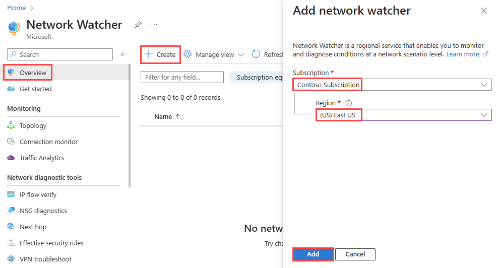 Network Watcher 추가에서 Azure 구독을 선택한 다음, Azure Network Watcher를 사용하도록 설정할 지역을 선택합니다.