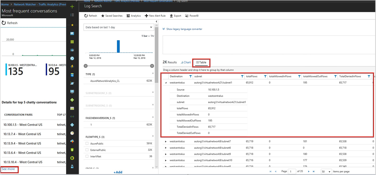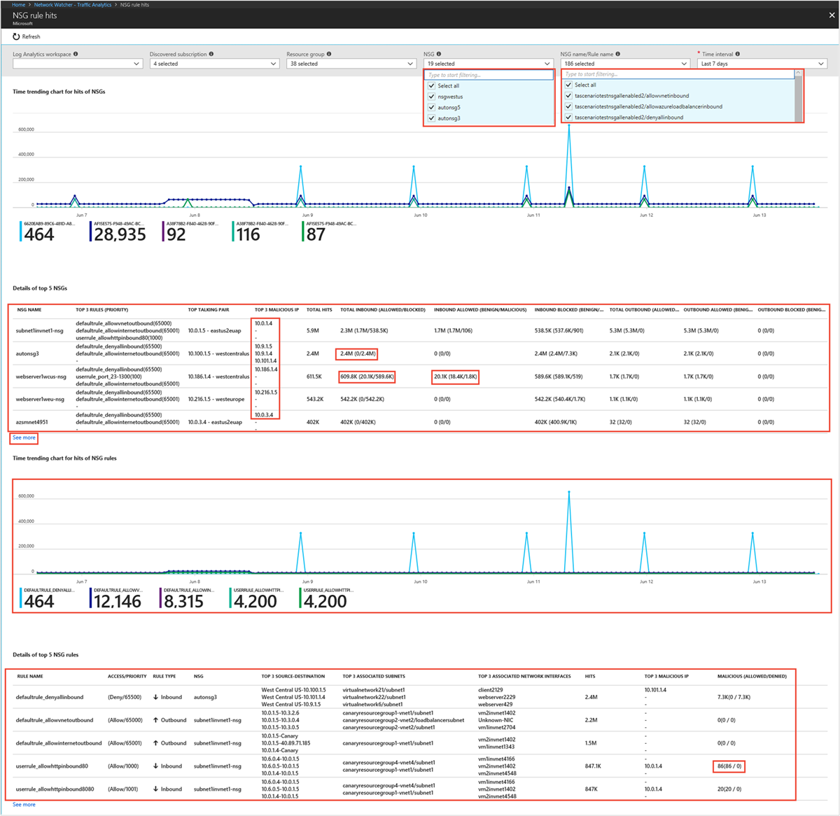 다음 그림은 NSG 규칙에 대한 시간 추세와 네트워크 보안 그룹에 대한 원본-대상 흐름 세부 정보를 보여 줍니다.