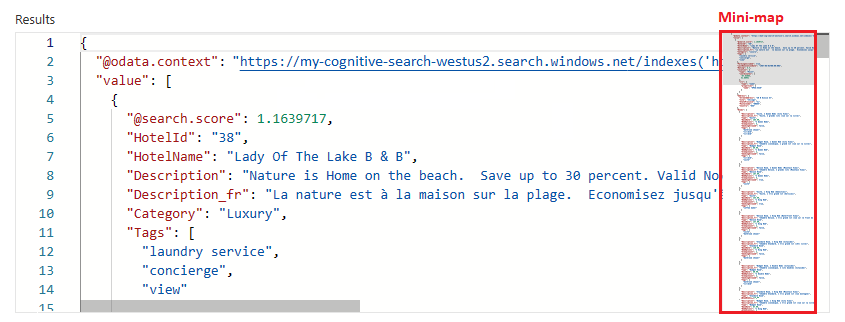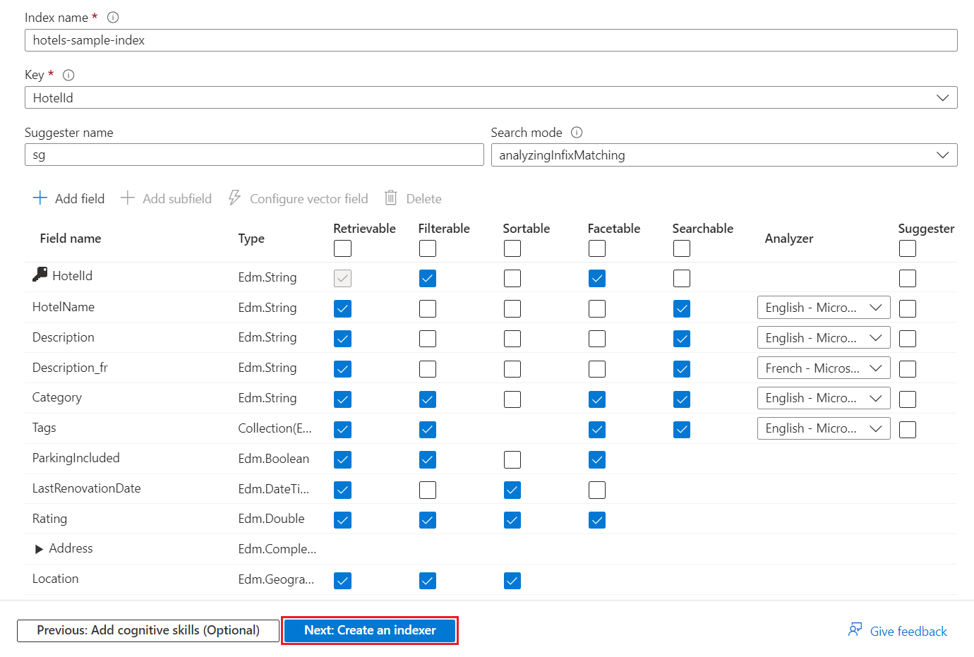 샘플 호텔 데이터의 구조와 내용에 따라 마법사는 검색 인덱스에 대한 스키마를 유추합니다.