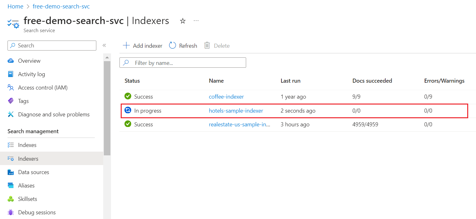 목록에서 hotels-sample-indexer 를 찾습니다.