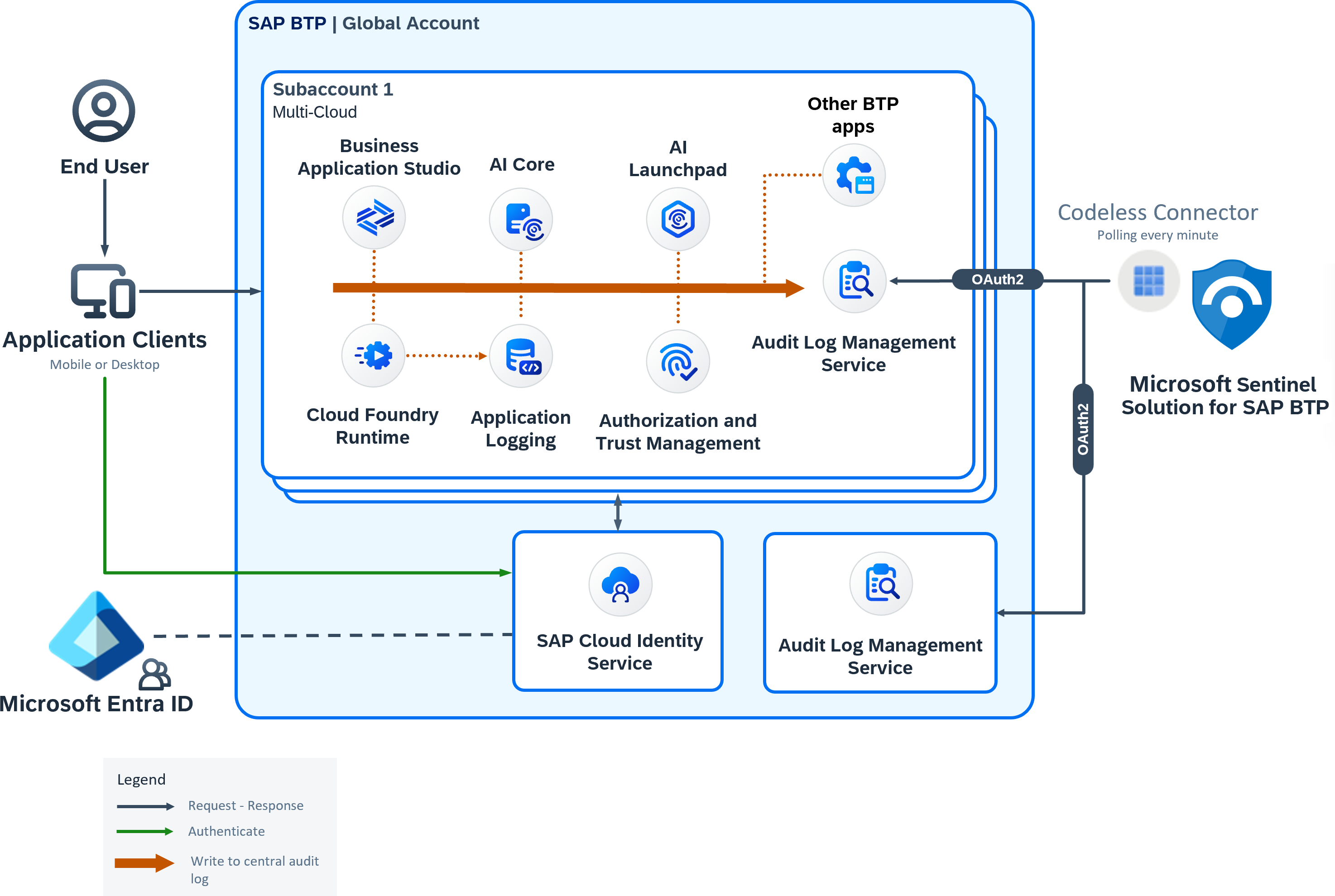 다음 이미지는 Microsoft Sentinel이 SAP 감사 로그 관리 서비스를 사용하여 전체 BTP의 감사 로그 정보를 검색하는 방법을 보여 줍니다. SAP BTP용 Microsoft Sentinel 솔루션은 선택한 시나리오에 대한 기본 제공 분석 규칙 및 검색을 제공하므로 더 많은 감사 로그 정보 및 이벤트를 포함하도록 확장할 수 있습니다.